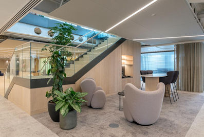 The completed workspace highlights refined finishes, strong spatial flow, biophilic elements and an intelligent use of space to create both private and collaborative zones within the open plan environment.